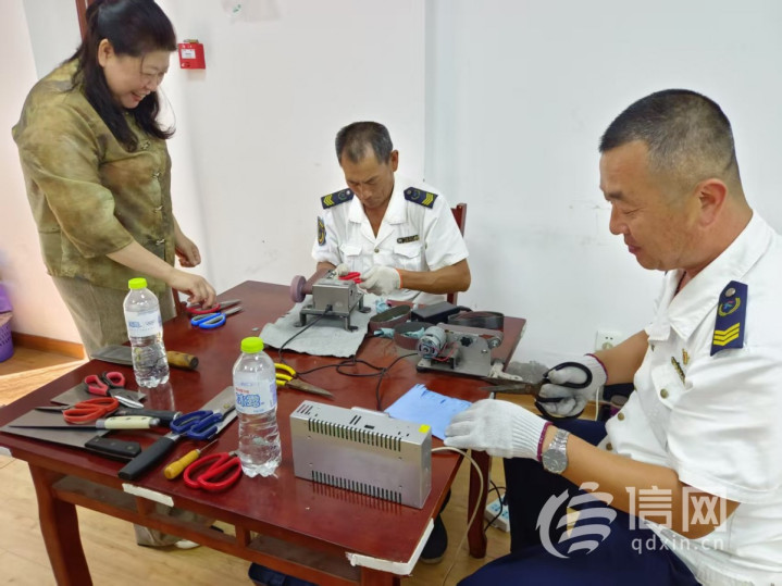 在磨刀服务专区,来自青岛城运控股公交集团城阳巴士有限公司第十一分公司“萤火之光”志愿服务团队志愿者韩帅正在打磨一把锈迹斑斑的剪刀,由于剪刀使用时间久了,表面受损严重,给打磨带来了一定难度。“像这种剪刀比一般剪刀打磨起来要更费时一些,每个角度都要一点点打磨好,然后再一遍遍试,检查一下哪里还需要进一步打磨,需要静下心来,急不得。”韩帅告诉记者。